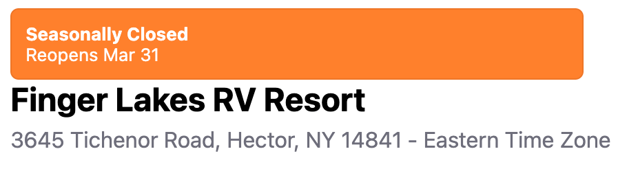 Most of the RV resorts in the north are seasonable. Finger Lakes RV Resort is Seasonally Closed. I reserved my site online. I did an in-depth research for this campground, reading all of the policies and reviews. I needed to make sure they do not have a two dog limit.