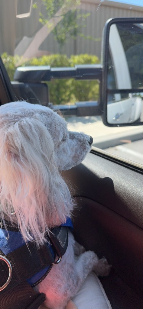 Today, when we dropped BooBoo off at Deb’s, Hubby took him in. When Deb took BooBoo in her arms, BooBoo smothered her with kisses all over her face. We picked BooBoo up in an hour and a half and he was so happy to be back on my lap in the Big Boy Truck.