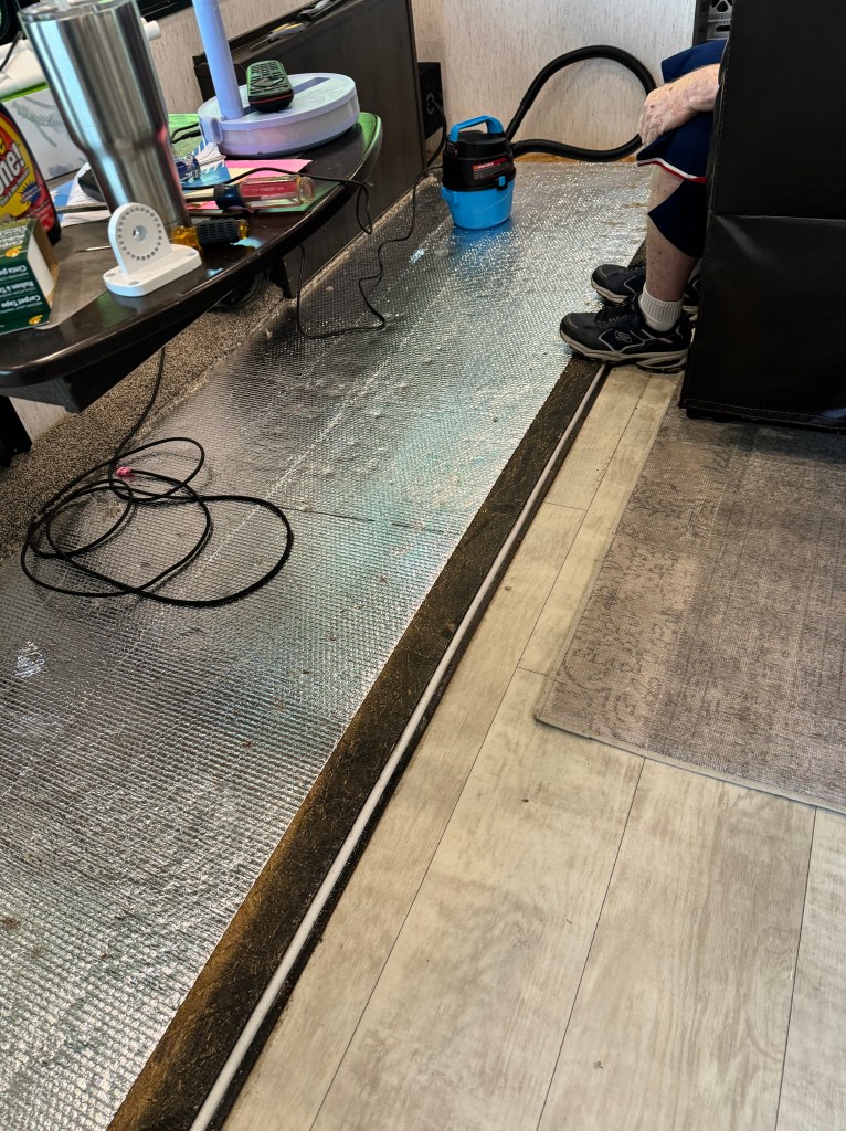 I did a huge project a week ago. Our kitchen/living area has vinyl flooring everywhere EXCEPT for where the slide out is. Our carpet was a mess and I could not stand to look at it anymore. We ordered the carpet from General RV in Ocala Florida. The carpet was rather cheap, but the shipping was more expensive than the carpet. The carpet was an exact replacement of the carpet I removed. With Hubby’s back problems, I did most of the work removing and replacing the carpet. Hubby did help me a little pulling the carpet out of the stapled areas. He also helped sweep up the area. The first image is after the carpet was removed and the second image was after I installed the replacement. I do have to admit, it was a little harder of a chore that I thought it would be but it was well worth the cost and the efforts involved.