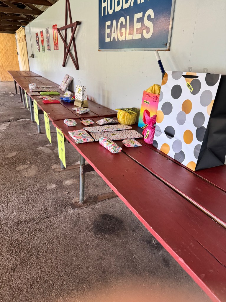 It stormed all day yesterday. I offered to run Bingo while we are in the park. We are here for two months in the spring and one month in the fall. Around 50 people showed up for Bingo. The park gives out gifts for Bingo, especially because kids are allowed to attend. We had a table of prizes for all ages.
