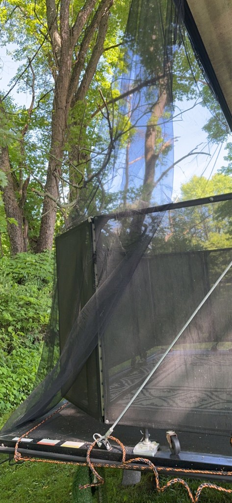 We have much privacy when sitting on our deck, but the Cherry trees have crap falling out of the trees. I bought netting so we can sit without having the crap falling on us and our fur kids.