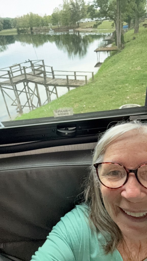 Our site is concrete with a great view of their lake. I took this picture from the inside of our Truck Camper, which I will call “Our Small Home”.